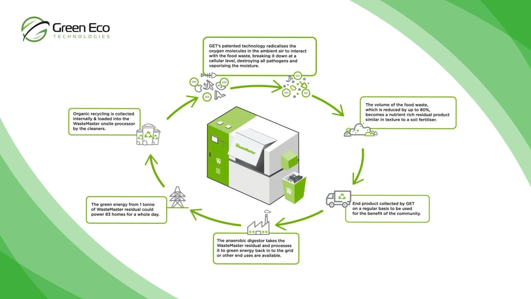 Our innovative WasteMaster recycling technology diverts food and other organic waste from landfill, from being flushed into the sewer system or incinerated, reducing future damaging effects on our environment including greenhouse gas emissions.